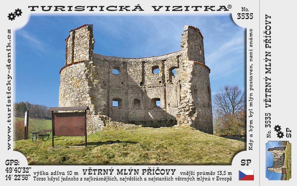 Na skalním návrší u Příčov se vypíná torzo větrného mlýnu holandského typu. Jde o zbytky jednoho z nejstarších (asi polovina 16. či 17. století-přesná doba vzniku není známa) nejkrásnějších a největších větrných mlýnů holandského typu nejen u nás, ale i v celé Evropě. Tato unikátní stavba se tyčí asi půl kilometru severozápadně od obce, na návrší poblíž rozcestí, kudy prochází silnice do Dublovic. Až se dostatečně pokocháte a toto mistrovské dílo také případně zvětšíte na fotografiích, pokračujte dál na Sedlčany.
