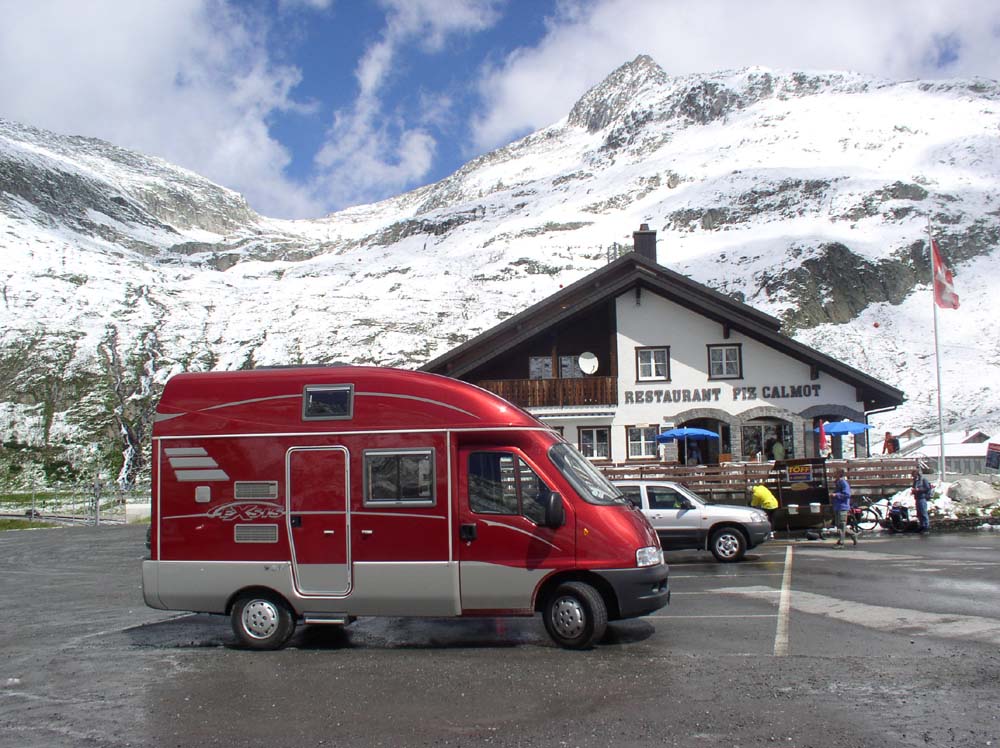 Z Churu vyrážíme už za sluníčka směrem k Sedrunu a dále k průsmyku Oberalppass ve výšce 2033 m.n.m. V dálce vidíme zasněžené kopce, a začínáme tušit, co nás asi čeká. S přibývající výškou začíná sněhu přibývat, na vrcholu nás čeká souvislá pokrývka.