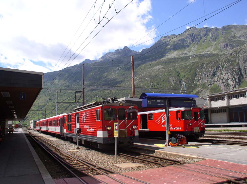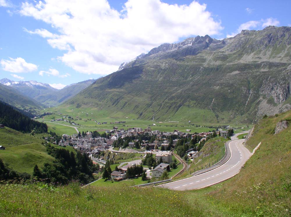Pomalu sjíždíme serpentinami do lyžařského střediska Andermatt (1436 m.n.m.), kde odstavujeme vozidlo hned vedle nádraží. Po prohlídce městečka si děláme malý výšlap do horské přírody. Na protějším svahu se co chvíli objevují červené vlakové soupravy, zdolávající značný výškový rozdíl. Zdálky vypadají jako modelová železnice.