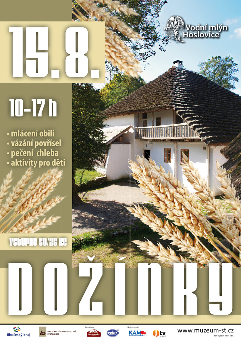 V sobotu 15. srpna připravilo Muzeum středního Pootaví Strakonice ve Vodním mlýně v Hoslovicích tradiční akci Dožínky. Přesný časový harmonogram bude uveden v den akce na kase a v areálu mlýna.