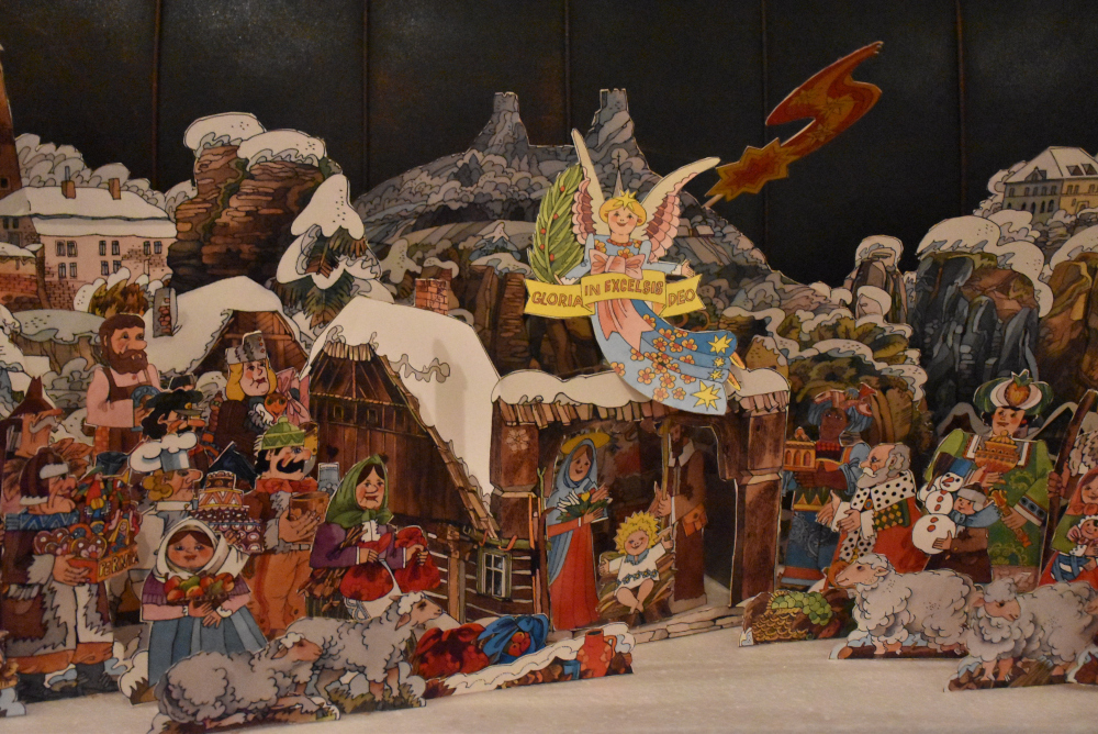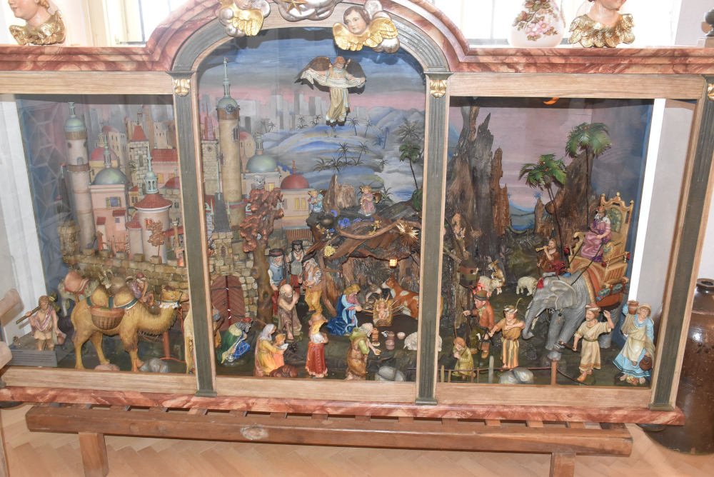Skříňový betlém Antonína Maška ze Stružince s barokní výzdobou a až pohádkovým pozadím z roku 1859 (druhý nejstarší ve sbírkách lomnického muzea)
