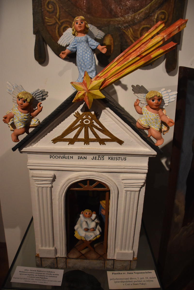 Betlémová scenérie řezbářky Jarmily Haldové ze Sedloňova umístěný do věrného modelu opravené kapličky na Podměstí za viaduktem v Lomnici n. Pop. (exponát byl zhotoven díky finanční sbírce návštěvníků předcházejících vánočních výstav – velmi děkujeme všem dárcům!).