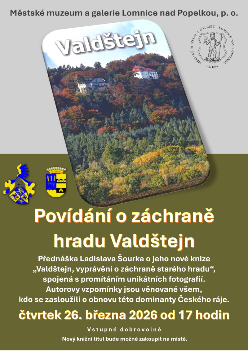Jarní přednáškový cyklus pokračuje povídáním pana Ladislava Šourka spojeným s promítáním unikátních fotografií o jeho nové knize „Valdštejn, vyprávění o záchraně starého hradu“. Autorovy vzpomínky jsou věnovány všem, kdo se zasloužili o obnovu jedné z dominant Českého ráje. Akce se uskuteční ve čtvrtek 26. 3. od 17 hodin a nový titul si zde budete moci zakoupit. Vstupné je dobrovolné.