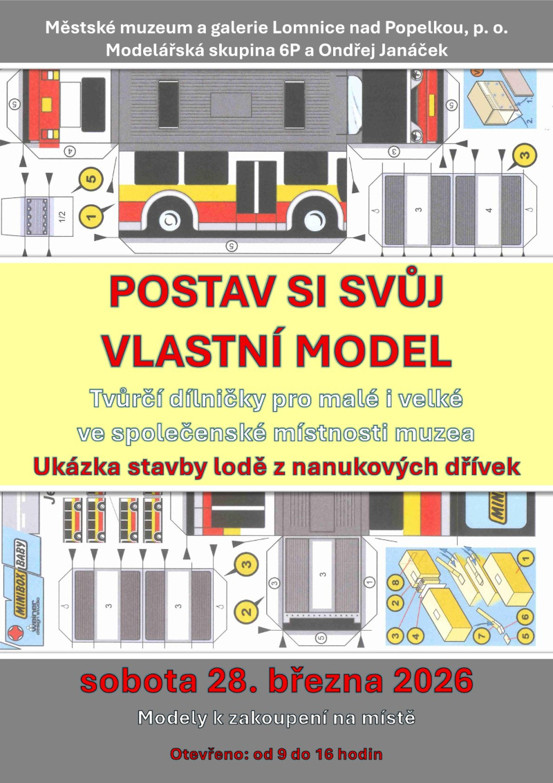 V sobotu 28. 3. v době od 9 do 16 hodin budou moci všichni zájemci o modelařinu navštívit dílničky, které pro Vás připravili novopačtí modeláři ve spolupráci s městským muzeem na akci nazvané „Postav si svůj vlastní model“ doplněné o ukázky stavby modelu lodi z naukových dřívek panem Ondřejem Janáčkem. Papírový model ke stavbě si budete moci koupit přímo na místě. Zároveň autoři výstavy budou během dne provádět komentované prohlídky a rádi zodpoví veškeré dotazy týkající se tématu. Srdečně zveme.
