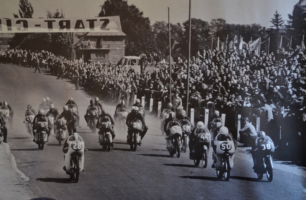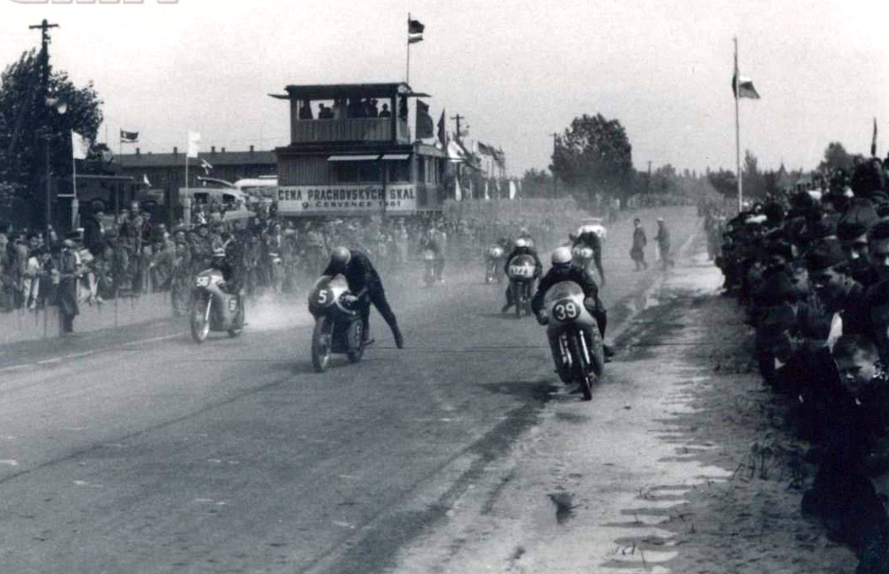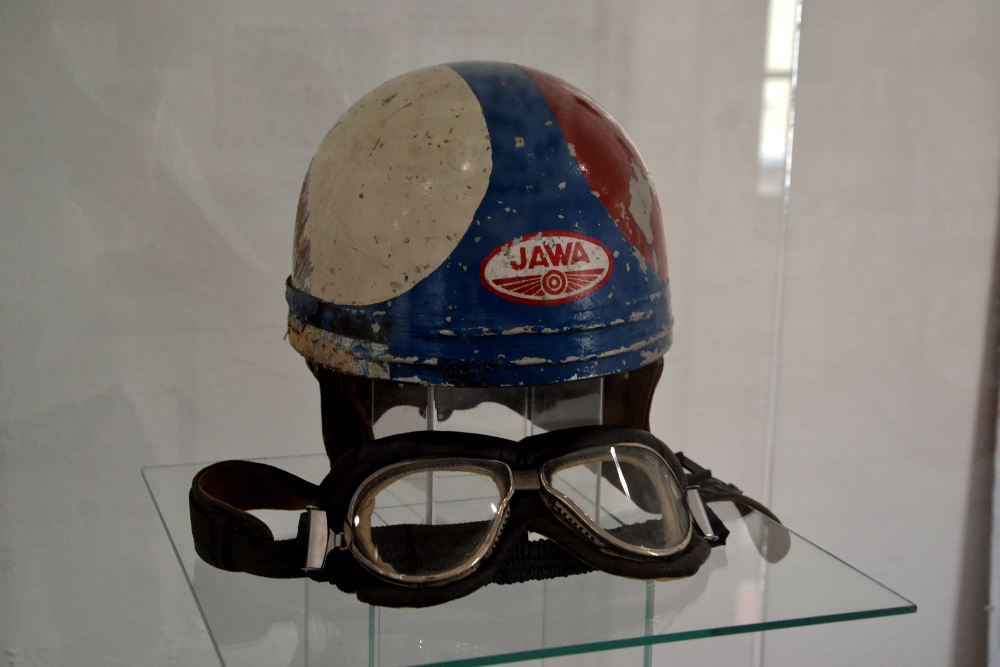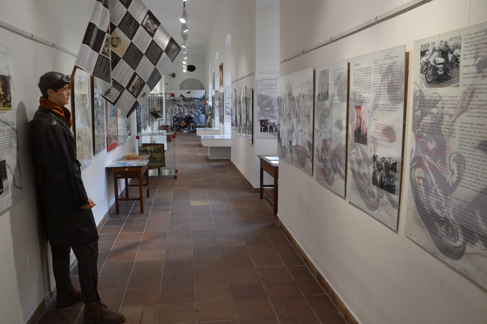 Kolik musel jet na konci rovinky od Jinolic k Jičínu jsme nezjistili, ale na výstavě jsme se dočetli, že v roce 1961 se tady na třistapadesátkách jezdilo běžně 230 km/h. Z téhle rychlosti jezdci brzdili, aby zatočili do ostré pravé zatáčky na kostkách, často navlhlých.