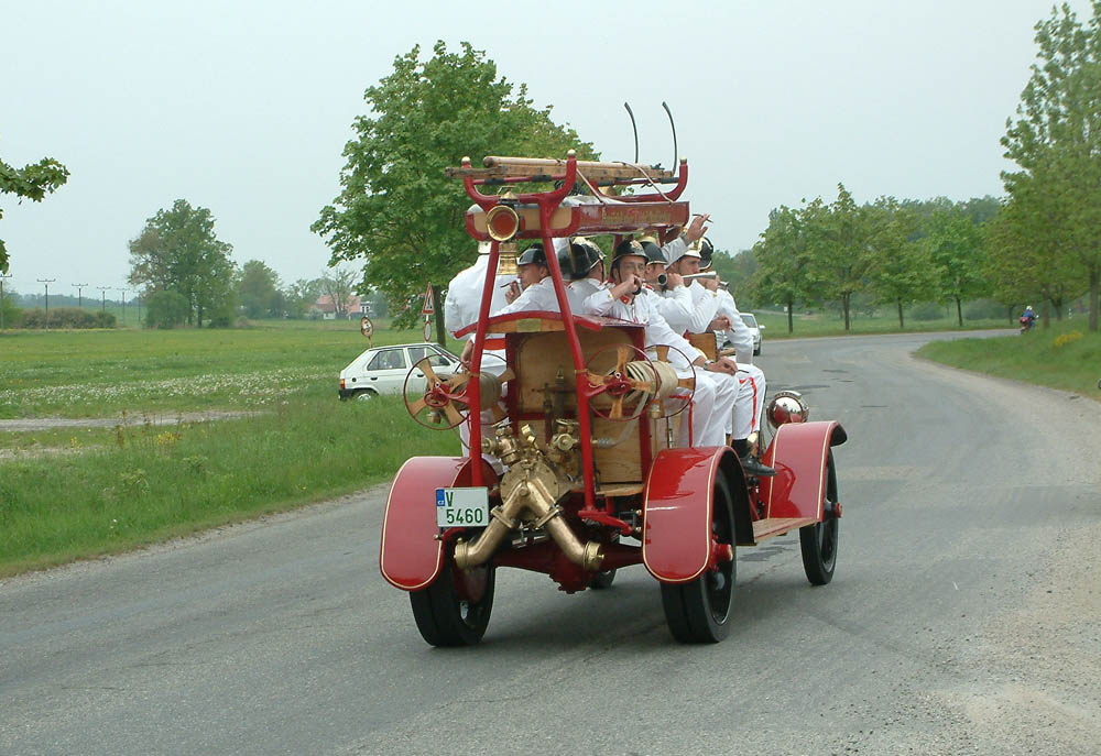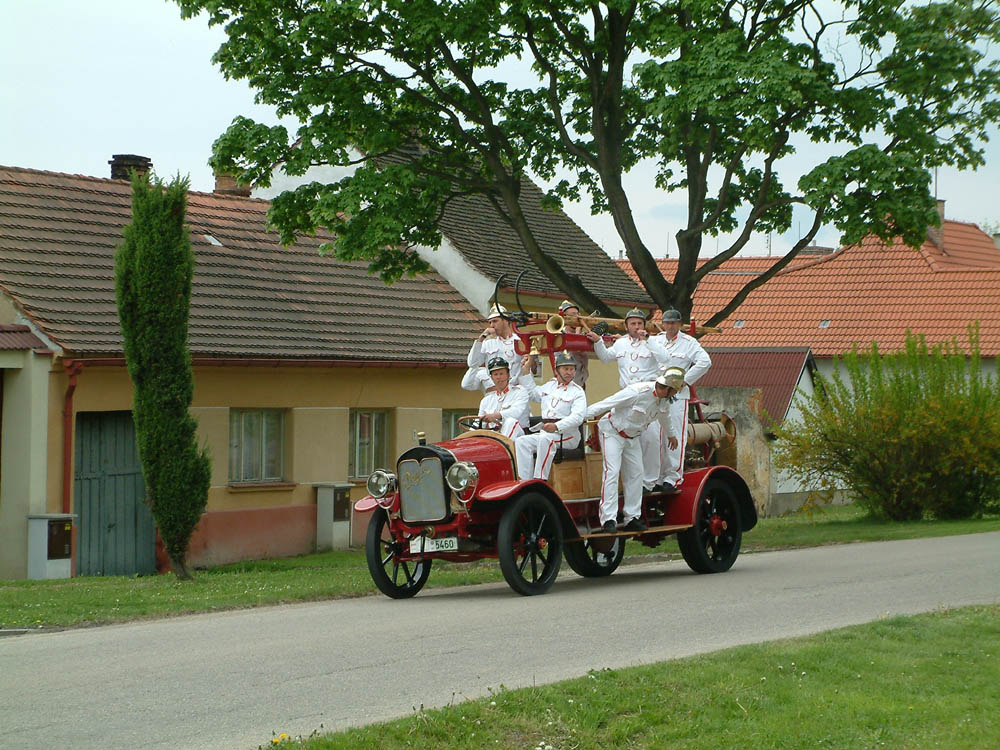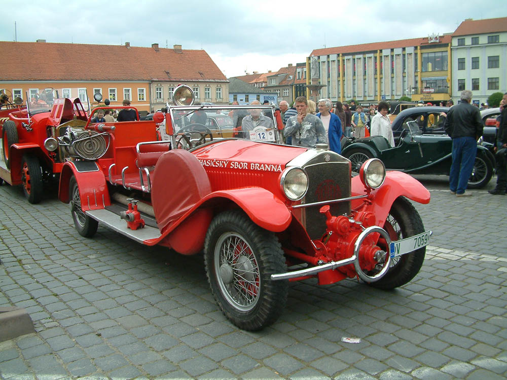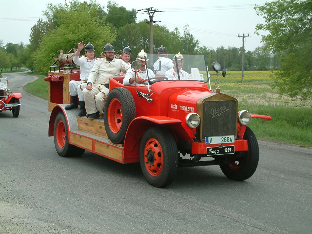 Letos se divákům představilo hned pět vozidel z let 1915 až 1936. Nejstarším a proto i právem nejvíce obdivovaným byla nedávno nádherně zrenovovaná Praga R vyrobená v roce 1915 jako nosič reflektorů pro CK rakouskou armádu. Benzinový čtyřválec 3,8 litru dosahoval výkonu 35 k, což stačilo na rychlost 35 km/h. Takže asi bylo třeba často udržovat oheň než dorazila jednotka na místo, nehledě k tomu, že na 100 km spotřeboval vůz mezi 36 až 48 litry benzínu. Takřka pětimetrový automobil měl mechanické brzdy jen na zadní kola, plné pryžové obruče o rozměru 910 x 100, vzadu dvojmontáž. Přestavbu na hasičský vůz provedla v roce 1926 firma Josef Vystrčil Telč.