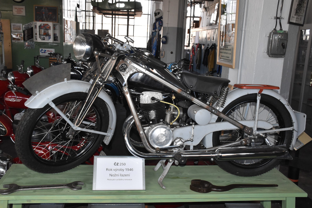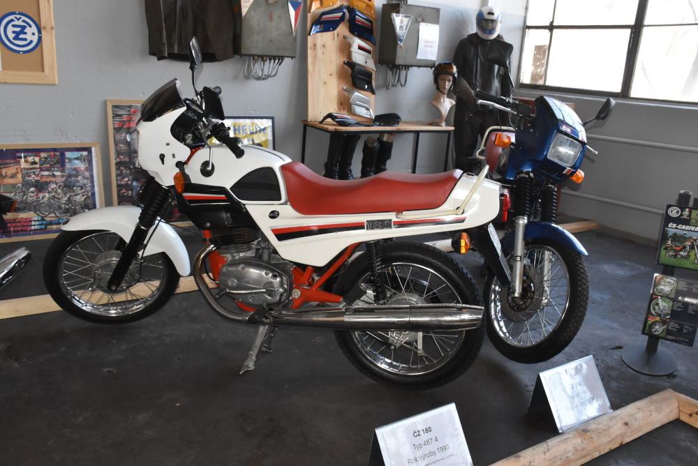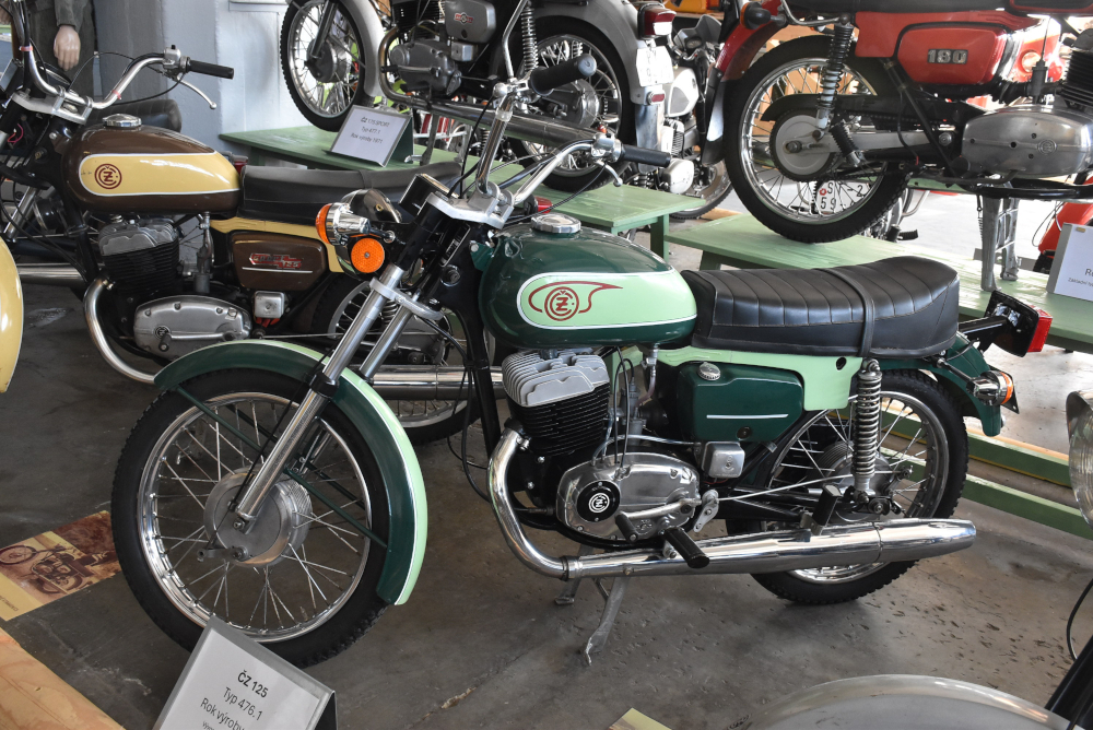 DOKONČENÍ: První patro je věnováno výhradně motocyklům a artefaktům ČZ od motokola z roku 1932 (bylo vyrobeno pouze 500 ks) až po motokrosové speciály. Většina strojů je v typické černé barvě, zatímco jawa používala barvu červenou. Ale najdeme tady i modrou ČZ 125 z roku 1964, určenou pro vývoz do USA