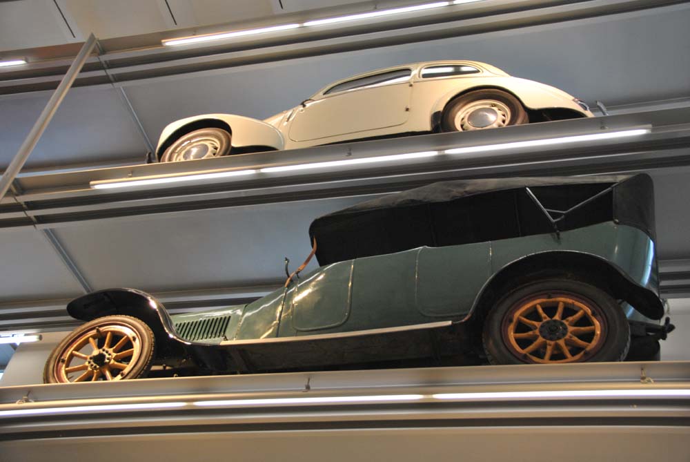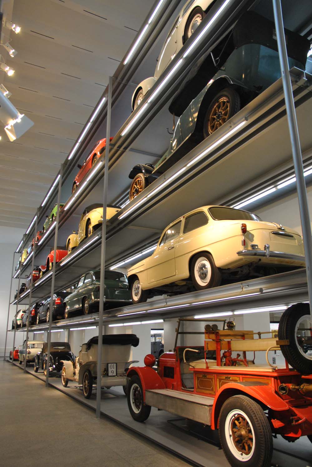 Vrcholem expozice je čtyřpatrový regál s dvaceti automobily. Prohlédnout si ale můžete jen pět automobilů v „přízemí“, z ostatních vidíte jen kousky podvozků, kola nebo případně výfuk.