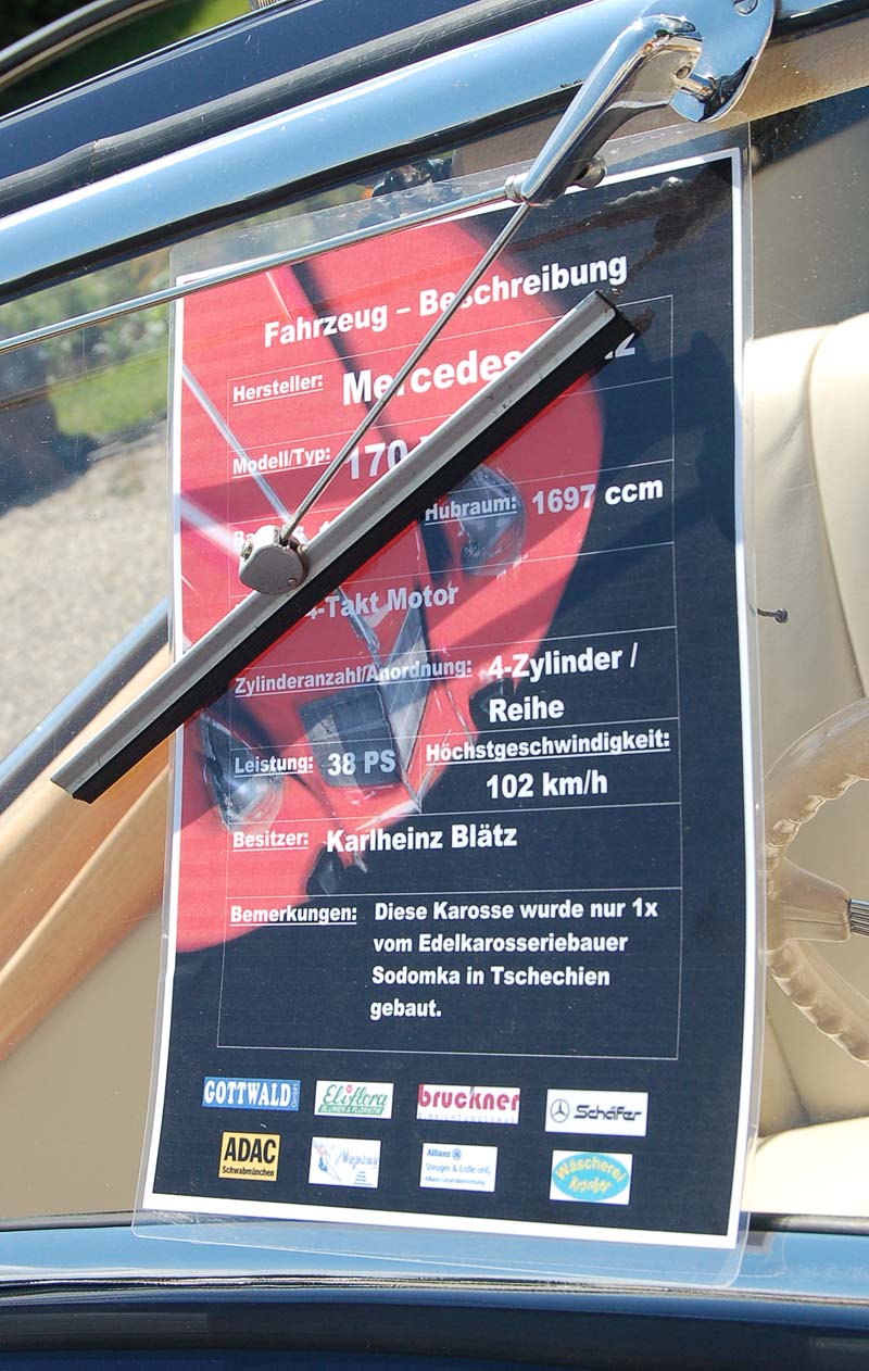 Původní popiska u vystaveného automobilu uváděla, že podvozek Mercedesu 170 byl v dubnu 1937 dodán do Liberce a po válce, v letech 1946 až 47 se poškozené auto dostalo k Josefu Sodomkovi, který na něj vytvořil tuto karosérii. Zde se však nabízí několik závažných otázek, které celou historii tohoto automobilu poněkud komplikují.