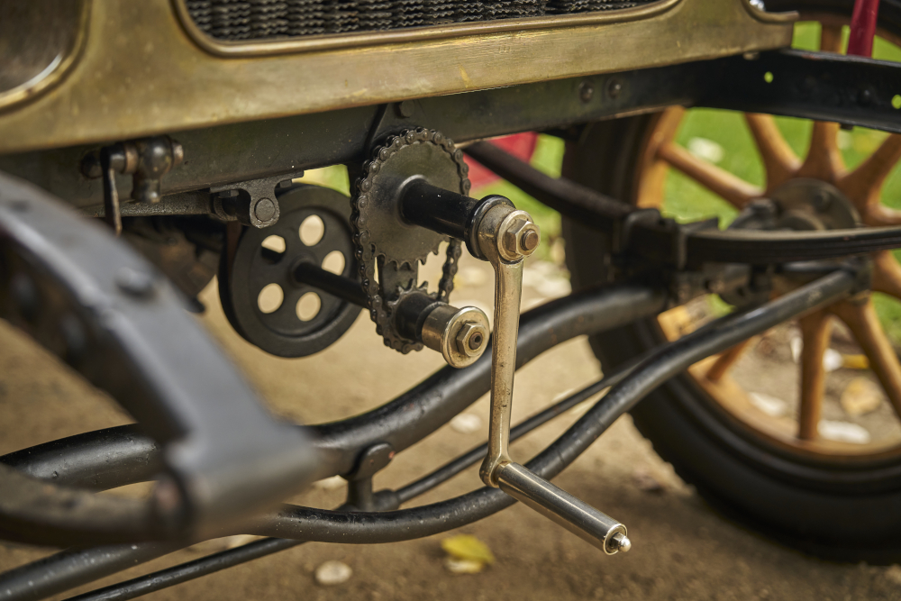 Nastartováno bychom měli, ale jak se teď rozjet? Vpravo od řidiče jsou dvě páky. Levá slouží k řazení, pravá jako ruční brzda působící na zadní kola. Levý pedál patří stejně jako dnes spojce, pravý brzdě působící na převodovku. Plyn se i při jízdě přidává a ubírá páčkou na volantu. Zkušený šofér takto vůz dokázal rozjet až na 40 km/h.