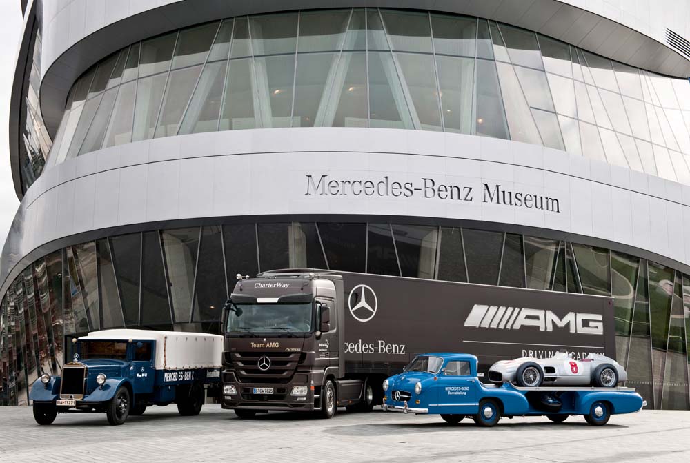 Přestože všechna tři nákladní vozidla vypadají rozdílně a byla vyrobena v jiné době, mají jedno společné, všechna přepravovala Stříbrné šípy Mercedes-Benz. Rodinné setkání tří generací potvrzuje skutečnost, že děti bývají větší než rodiče, jak dokládá třeba Actros s návěsem o délce 16,5 m. Jeho předchůdci vypadají jako autíčka na hraní.