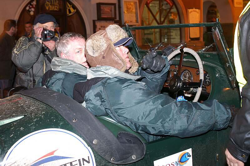 Ještě v uličce na křižovatce se přede mnou zprava vyřítil krásný oldtimer cabrio .....a tak honem za ním, snad si na náměstí uvědomí chybu. Taky jo, stojí na konci, honem zaparkuji a už se točí krásný Alvis Silver s číslem dvě a já mačkám spoušť. Spolujezdec zabodnuté oči v mapě. Přiskakuji: „You must straight on, to the left, to right and go down around the church and to right finish“. Dvěma zakuklencům v kožichu se ulevilo. „Yes, Thank you“ .