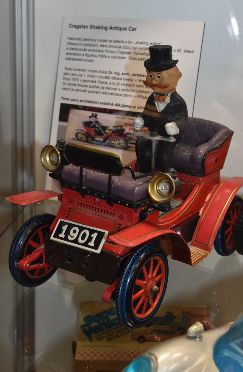 Jeden z exponátů, tzv. Cragstan Shaking Antique Car, má dokonce vztah k zámku. Tento konkrétní model získal Dr.Ing.arch. Jaroslav Huňáček jako cenu za první místo v soutěži dětské kresby v rámci světové výstavy Expo 1970 v japonské Osace, a to již ve svých osmi letech Do muzea autíček jej daroval s osobním vztahem k místu, neboť je zároveň autorem rekonstrukce zámku v Přísece.