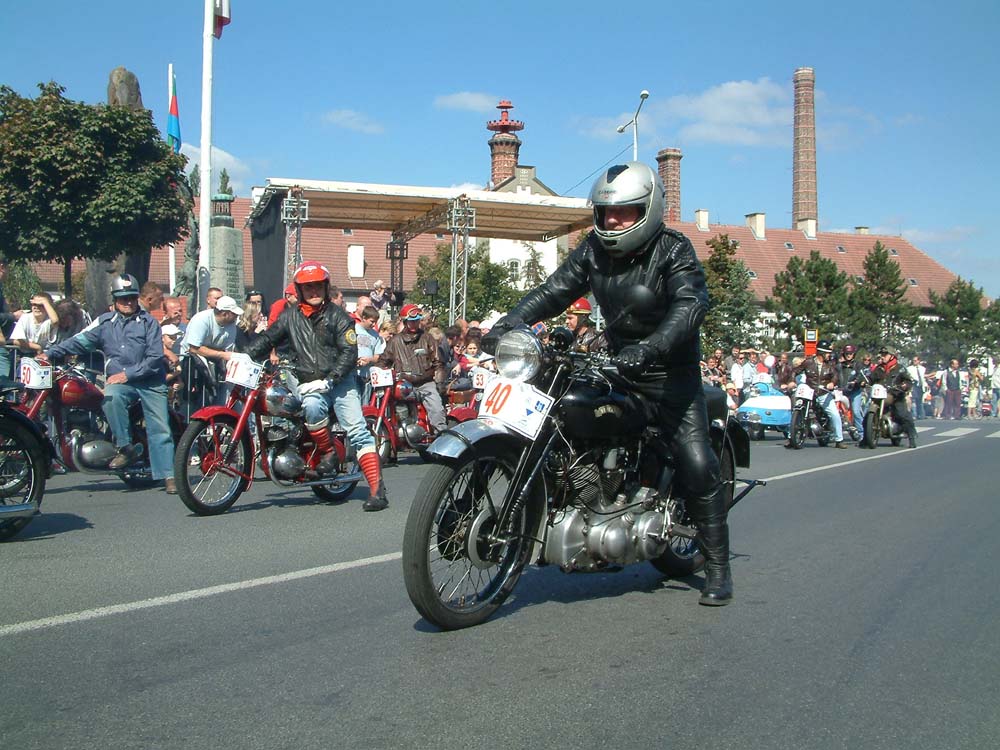 Po dopolední výstavě se ve 13 hodin vydají na čtyřkilometrovou trať se deseti zatáčkami a převýšením 163 metrů, směrem k Cukráku, nejdříve motocykly, kterých jsme napočítali zatím více než šest desítek. Jako první vyrazí Jaroslav Klouda se strojem Douglas z roku 1919 a Jan Úředníček na motocyklu značky Martisyder, který je o tři roky mladší a disponuje zhruba jednou tak velkým objemem – 687 cm³ (výkon 15 k). Zajímavý stroj – FN M 60 představí také veteránista Otto Nyč. Pochází z roku 1925 a pohání jej motor o objemu 348 cm³ a výkonu 9 k. Z dalších zajímavých značek uvidí diváci mj. motocykly BSA, Praga, Ariel, Indian Scout, Truimph, Dürkopp, Moto Guzzi a nejrůznější modely Jawa a ČZ, které také mají početní převahu. Nemladším strojem bude Ducatti 900 GTS z roku 1979.