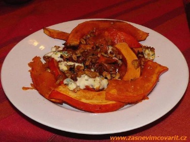 Dýni umyjeme, nemusíme loupat (jen zbavíme jader) a rozkrájíme na kostky a dáme na plech. Pokapeme olivovým olejem a dáme péct do trouby. Zhruba po 25 minutách posypeme ořechy, pečeme dalších 10 minut. Těsně před dopečením, posypeme sýrem.