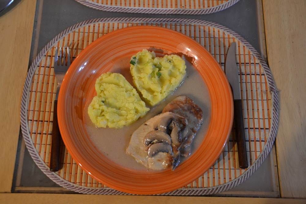 Vepřové plátky, po kraji naříznu, aby se nekroutily. Omyju je a osuším. Osolím a opepřím z obou stran. Každý potřu hořčicí a posypu hladkou moukou. Vkládám do rozpáleného oleje a opeču po obou stranách. Nakrájenou cibuli nechám zesklovatět a přendám na ni maso. Podliju vývarem a v tlakovém hrnci 25 minut dusím. Poté maso vyjmu a přecedím na něj šťávu. Pokud je šťávy málo, přiliju vývar, zahustím lžičkou hladké mouky rozkvedlanou v malém množství vody a nechám povařit. Do hotové omáčky přidám připravené žampiony. Ty nejprve oloupu, nakrájím na plátky a na lžíci másla orestuji. Podliju červeným vínem a přidám bylinky. Když mám, tak čerstvé. Dnes jsem použila směs sušených řeckých, ale postačí i třeba jen tymián. Jako příloha se výborně hodí šťouchané brambory.