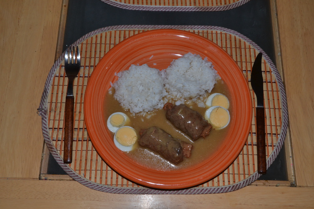 Plátky masa naklepeme, potřeme olejem a necháme v chladu alespoň dvě hodiny uležet. Lepší je nechat maso do druhého dne. Maso pak bude šťavnaté a křehké. Potom osolíme, potřeme hořčicí, poklademe plátky šunky, pevně svineme, ovážeme nití a obalíme v mouce. Na rozpáleném oleji opečeme. Pak přidáme najemno nakrájenou cibuli, bobkový list, podlijeme vývarem, přiklopíme a pozvolna dusíme. Čím pomaleji, tím lépe. Já jsem použila papiňák. Měkké maso vyjmeme a uložíme na teplém místě. Omáčku přecedíme, přidám najemno pokrájené kapary/nemusí být/, worcesterskou omáčku a celý pepř. Ještě krátce povaříme. Závitky v polovině rozkrojíme, naservírujeme a podáváme polité omáčkou.