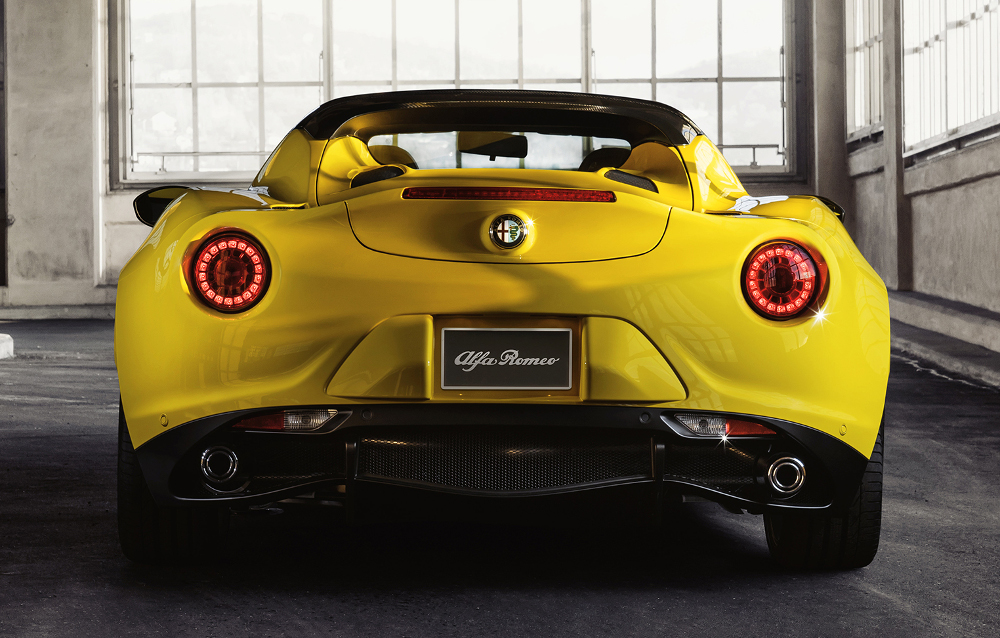 Motor je ukryt pod funkční a estetickou kapotáží s aerodynamickým spoilerem a se třemi funkčními výdechy, které odvádějí teplo motoru. Z hlediska stylu jsou v dokonalém souladu s velkými vstupy vzduchu k chladičům na bocích vozu. Dolní část zádě doplňují v rozích umístěné koncovky výfuku, které dále posilují supersportovní povahu modelu 4C Spider. Ze studie 4C Spider Concept se do produkční verze dostal nový dvoustupňový centrální výfukový systém Akrapovič, nabízený na přání (k dispozici později).