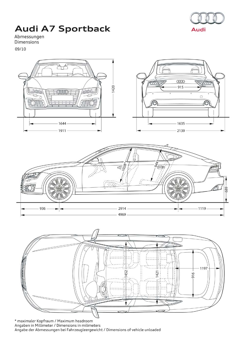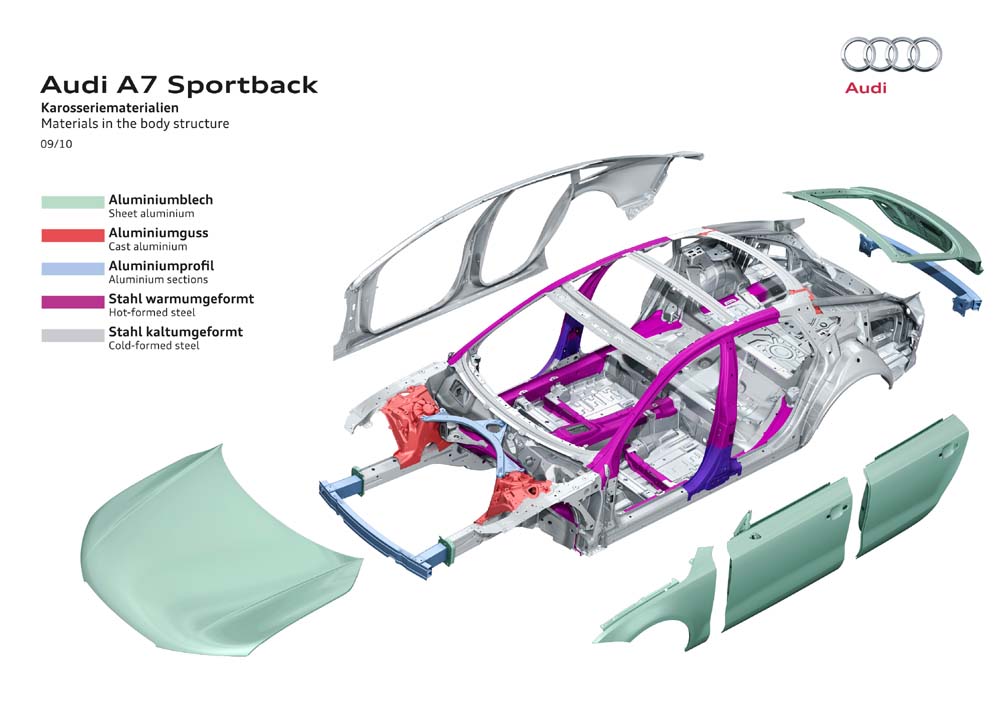 Audi A7 Sportback je dlouhé 4,97 m, rozvor 2,91 m, široké 1,91 m a vysoké 1,42 metru. Karoserie stanovuje nová měřítka také svou nízkou hmotností. Kombinovaná konstrukce karoserie z oceli a hliníku je o cca 15 procent lehčí než srovnatelná celoocelová karoserie. Jako příklad může posloužit model 3.0 TDI s výkonem 150 kW (204 k) a převodovkou multitronic, jehož pohotovostní hmotnost je v základní verzi 1695 kg (bez řidiče). Více než 20 procent karoserie je z lehkého hliníku.