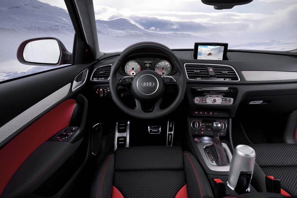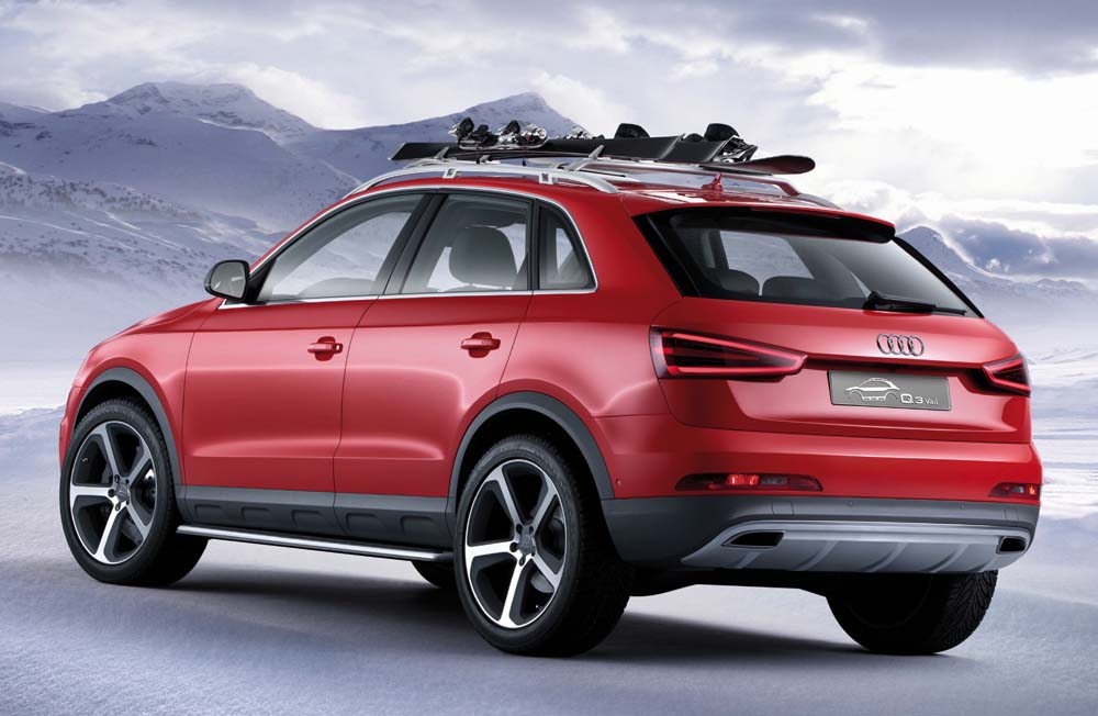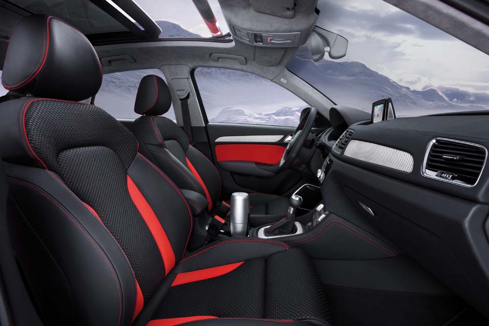Z profilu přitahují pozornost rozšířené podběhy kol a boční stupátka, které Audi zařadí do nabídky příslušenství pro Q3. Přepracované podélné střešní nosiče z hliníku jsou navrženy pro přepravu lyží a snowboardů – oba jsou z kompozitu vyztuženého uhlíkovými vlákny.
