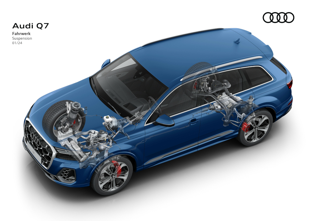 Na přání si mohou zákazníci objednat elektronicky řízené vzduchové odpružení s plynule adaptivním systémem tlumení – ve verzích adaptive air suspension nebo adaptive air suspension sport (sérieSQ7 TFSI a linie S line). V závislosti na přání řidiče a jízdní situaci se světlá výška karoserie mění až o 90 mm a nabízí navíc udržování stálé světlé výšky. Na dálnicích se automaticky sníží světlá výška až o 30 mm v závislosti na rychlosti jízdy, u verze adaptive air suspension sport o 15 mm. V terénu lze voličem jízdních režimů Audi drive select při nízkých rychlostech zvýšit světlou výšku až o 60 mm prostřednictvím funkce „zvýšit“.