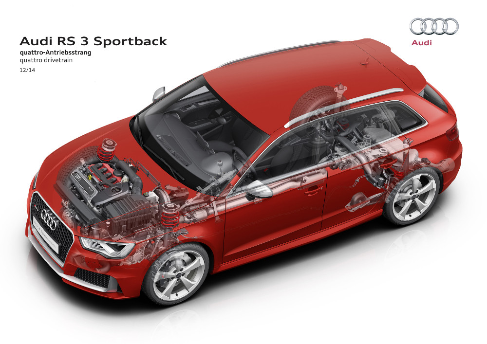 Hlavní součástí trvalého pohonu všech kol quattro je elektronicky řízená a hydraulicky ovládaná mezinápravová vícelamelová spojka. Z důvodu optimalizovaného rozložení hmotnosti umístěna před zadní nápravou. Vícelamelová spojka používá speciálně pro Audi RS 3 Sportback upravený software a podle potřeby mění extrémně rychle rozdělení hnací síly mezi přední a zadní nápravu. V závislosti na jízdním stylu a přilnavosti může být na zadní nápravu přenášeno 50 až 100 procent hnací síly.