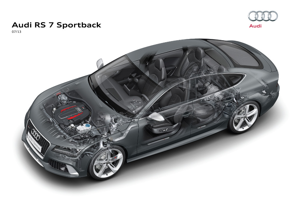 Audi RS 7 Sportback patří mezi nejdynamičtější sériově vyráběné vozy na českém trhu. Vidlicový osmiválec 4.0 TFSI, přeplňovaný dvěma turbodmychadly, mobilizuje ze zdvihového objemu 3993 cm3 nejvyšší výkon 412 kW (560 k) v rozpětí otáček od 5700 do 6700/min. Od 1750 do 5500/min je k dispozici maximum točivého momentu 700 N.m.