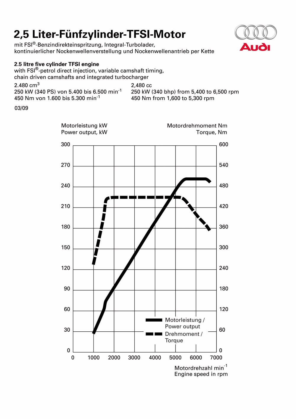 Po letech se Audi vrací opět k zážehovému pětiválcovému motoru, tentokrát o objemu 2,5 litru a výkonu 340 kN.m. Kombinace motoru s pohonem všech kol quattro a pečlivě vyladěným podvozkem promění kompaktní kupé a roadstery Audi TT RS ve špičkové sportovní vozy.
