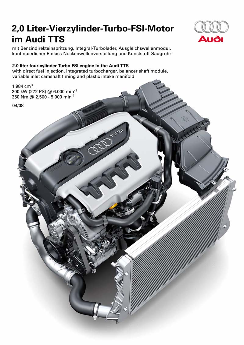 Základem motoru 2.0 TFSI v Audi TTS je verze o výkonu 200 k, z níž přebírá klíčové komponenty. Optimální plnění válců zajišťuje natáčení vačkového hřídele sání v rozsahu 42 stupňů; setrvačné síly a momenty druhého řádu vyrovnává dvojice vyvažovacích hřídelů rotujících dvojnásobkem otáček klikového hřídele.