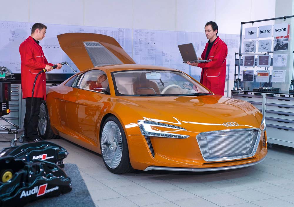 Model e-tron, představený na IAA 2009 ve Frankfurtu nad Mohanem, se vyznačuje fascinující dynamikou a příkladnou účinností. Čtyři elektromotory poskytují celkový výkon 230 kW a dvoumístné kupé katapultují z 0 na 100 km/h za 4,8 s, přičemž akcelerace pokračuje až do 200 km/h. Sada akumulátorů Li-Ion dává k dispozici 42,4 kWh využitelné energie, což postačuje k ujetí vzdálenosti cca 250 km na jedno dobití, které při použití silnoproudu trvá přibližně 2,5 hodiny. Za jízdy dochází navíc k rekuperaci kinetické energie během brzdění.