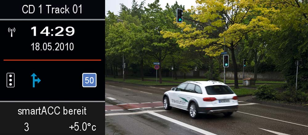 Semafory vysílají data, která se v graficky zpracované podobě objevují na displeji informačního systému řidiče. Řidič tak získává informace např. o tom, jakou rychlost musí udržovat, aby na dalších semaforech projel plynule na zelenou. Regulaci rychlosti pro udržení plynulého provozu může přenechat řídicí jednotce adaptivního tempomatu ACC.
