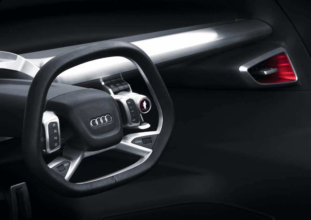 Na vzdáleném konci sloupku řízení se nachází displej zobrazující nejdůležitější informace. Malý šestiúhelníkový volant nese tlačítka a otočné spínače pro ovládání různých systémů včetně volby režimů Audi drive select pro elektrickou poháněcí soustavu.