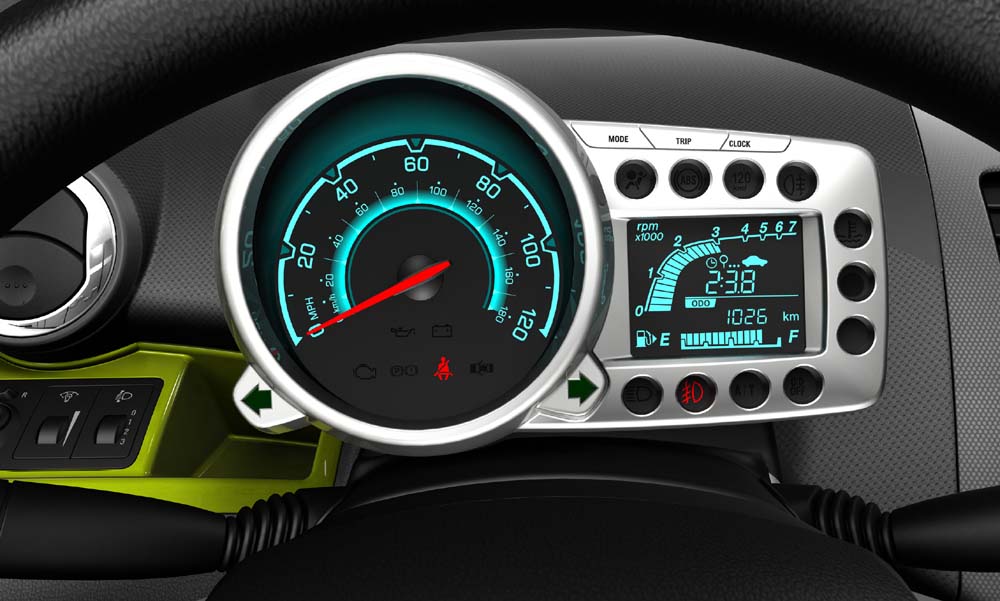 Originální přístrojový panel obsahuje velký otáčkoměr a displej digitálního rychloměru. Displeje audiosystému, topení a ventilace a navigace jsou elegantně včleněné v integrované středové konzoli.