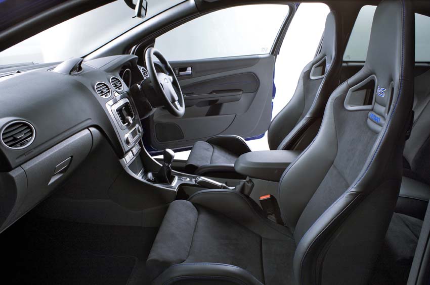 Interiér pokračuje ve stejném duchu jako vnější podoba. Dominantním prvkem jsou sportovní sedadla Recaro s anatomickým tvarováním. Barva čalounění ladí s vnějším lakem karoserie, na exponovaných místech nechybí kůže. Výrazně anatomicky tvarovaná jsou také zadní sedadla, jejichž dekorační grafika i provedení detailů beze zbytku odpovídají sedadlům předním. Každý detail interiéru v sobě odráží sportovní charakter. V centru pozornosti se ocitá masivní tříramenný sportovní volant a řadicí páka šestistupňové manuální převodovky, jejíž hlavici zdobí modré schéma řazení. Sportovní pracoviště řidiče doplňuje trojice přístrojů z Focusu ST: ukazatel plnicího tlaku turbodmychadla, teploměr oleje a tlakoměr oleje.