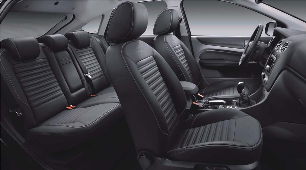 Paket Ford Individual pro Focus Ghia přináší exkluzivní celokožené čalounění sedadel, sestávající ze dvou druhů luxusní kůže. Na bočnicích sedadla i v horní části opěradla, dekorovaného vyraženým logem „Individual,“ byla použita jemná kůže Nappa, s níž kontrastuje výrazně zrnitá struktura kůže na středových plochách sedadla.