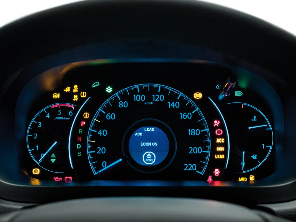 Ať za příplatek nebo jako součást vyšších výbav nabízí Honda CR-V nyní také mj. adaptivní tempomat ACC, systém pro udržování jízdního pruhu LKAS, systém pro zmírňování následků nehody CMBS (tyto tři systémy v jednom balíčku za 75 000 Kč) nebo systém pro jízdu s přívěsem. Systémy jako ABS, VSA jsou pochopitelně součástí už základní výbavy S, stejně jako například režim ECON či ECO Assist, oba známé z hybridních modelů. Režim ECON upravuje charakteristiku elektronického řízení škrticí klapky pro zajištění plynulého nárůstu točivého momentu a snížení spotřeby. ECO ASSIST zase pomáhá jezdit úsporně. O tam jak jedeme nás informuje rychloměr, respektive podsvícení palubní desky od zelené až po bílou.