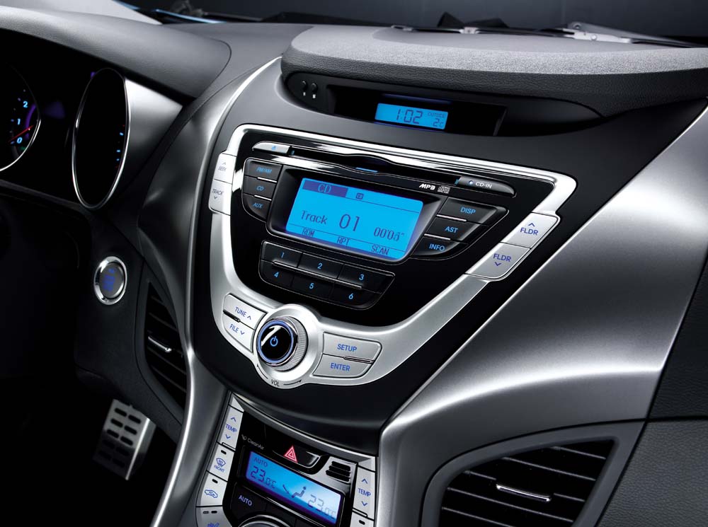 Vytříbený vzhled pokračuje v interiéru. Do oka ihned padne ozdobné obložení některých prvků interiéru ve stříbrném odstínu, které přechází v ladných tvarech z přístrojové desky do středové konzoly. Leskle černý lak a metalické barvy v interiéru zcela nové Elantry dotvářejí futuristický vzhled ve stylu high-tech.
