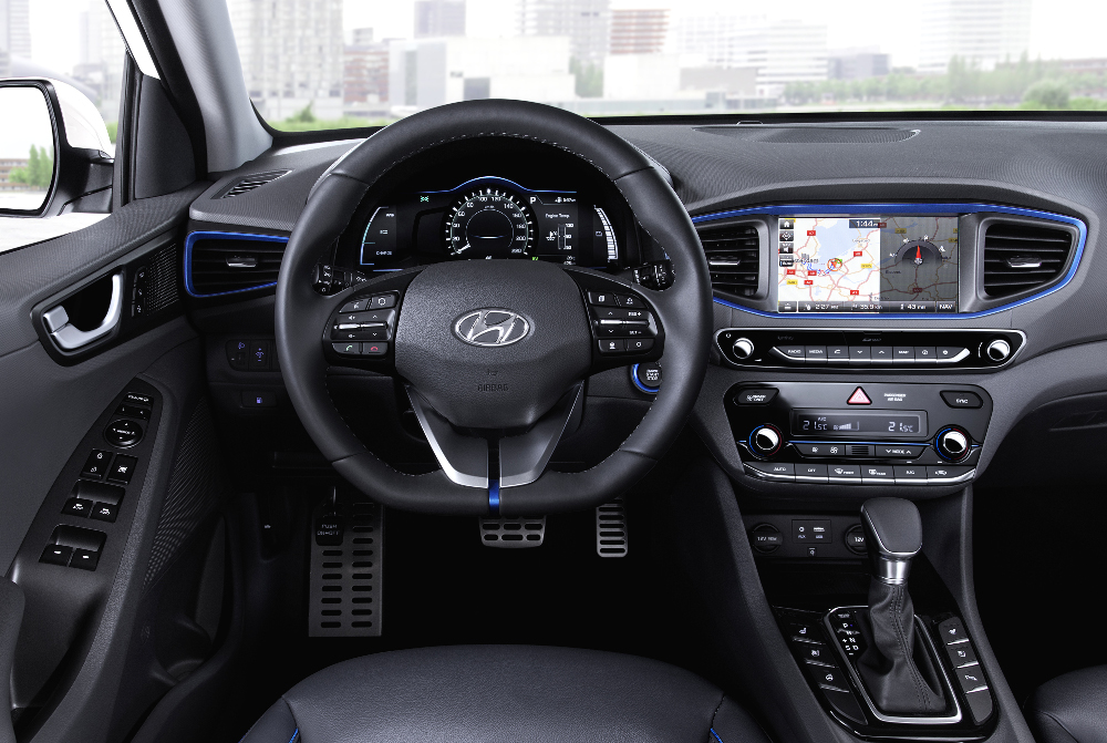 IONIQ je prvním modelem Hyundai v Evropě, který je vybaven novým 7“ informačním displejem TFT s vysokým rozlišením. Díky rozlišení 1280 x 720 pixelů zobrazuje všechny druhy přístrojů (rychloměr, ECO, stav nabití, množství paliva, atd.). V závislosti na zvoleném jízdním režimu se mění barva podkladu a přístroje, aby řidič dostával vždy nejdůležitější a nejpotřebnější informace. Použité barvy přitom vytvářejí uvolněnou nebo sportovní atmosféru. V režimu SPORT se na displeji objeví otočný digitální rychloměr, který je obklopen otáčkoměrem v analogovém stylu, jenž zobrazuje otáčky motoru na červeném podkladu. Po aktivaci režimu ECO napodobuje informační displej TFT dobře známou ručičku rychloměru.