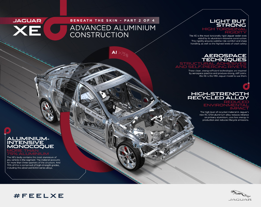 Lehká konstrukce je klíčovým prvkem DNA Jaguaru, který je v automobilovém průmyslu lídrem v oblasti hliníkových technologií. Modely XJ, XK nebo F-TYPE byly vyrobeny s mimořádně tuhou lepenou a nýtovanou hliníkovou konstrukcí. Tato technologie inspirovaná letectvím byla využita i pro nejnovější model XE.