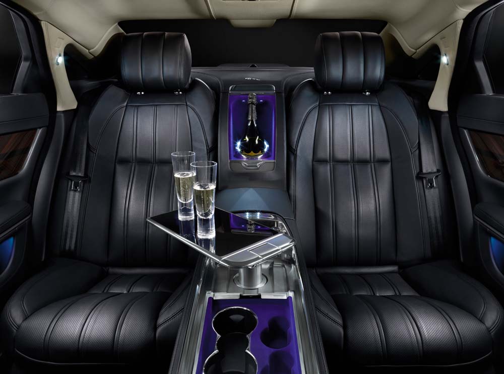 Pokud si pasažéři na zadních sedadel budou chtít odpočinout stačí jen otevřít panel chlazení a láhev šampaňského automaticky vyjede. Pod elektricky ovládaným stolkem se nacházejí dvě skleničky na šampaňské.