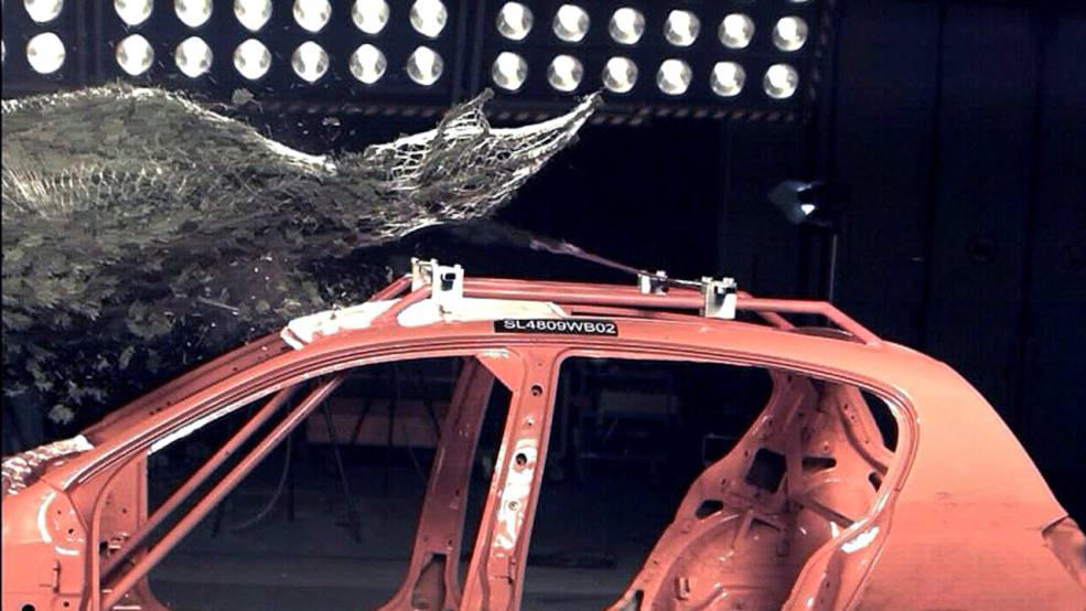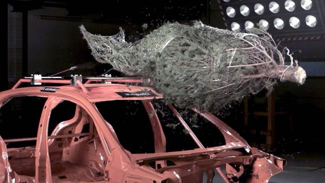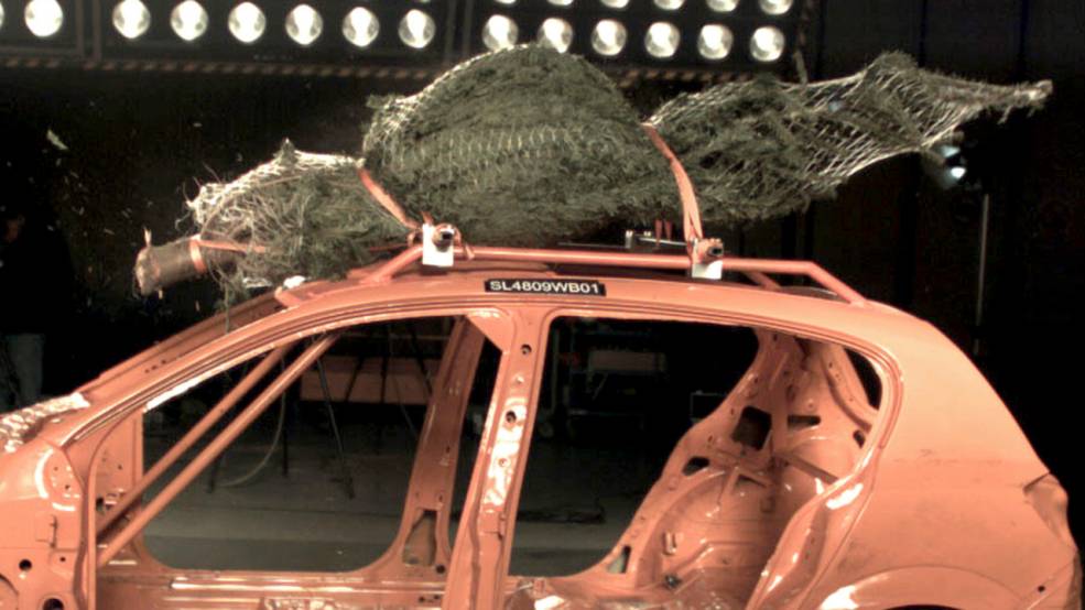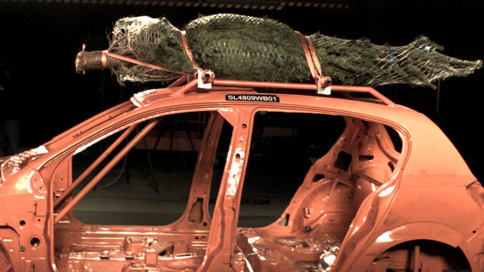 Při nárazu v rychlosti 50 km/h přeletěl strom zafixovaný expandérem nebo gumicuky dopředu přes kapotu. Při skutečné nehodě by strom o váze 32 kg ohrozil ostatní účastníky silničního provozu. Upínacími popruhy přivázaný strom oproti tomu zůstal při nárazu bezpečně na střeše. Oba příklady nárazu ukazují, že použití upínacích popruhů je nezbytné. Strom jimi samozřejmě také musí být správně připoután - správné fixaci stromku je tedy potřeba věnovat dostatek času a pečlivosti.