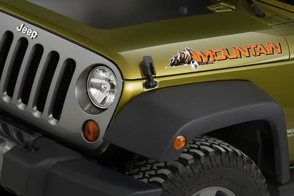 Jeep Wrangler Mountain vychází z balíčku Wrangler Sport S a je k dispozici ve verzích Wrangler a Wrangler Unlimited 4x4. Mezi prvky exteriéru patří potisk Mountain na kapotě se souřadnicemi zeměpisné šířky a délky odkazujícími na skutečnou polohu vzhledem k tématu Mountain; leštěná 17“ kola Moab Mineral Gray, mřížka a nárazníky; trubkové schůdky; černé lemy zadních světel a kryt palivové nádrže Mopar.