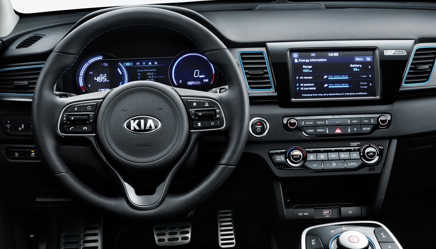 Vozy s akumulátorovým modulem se zvýšenou kapacitou 64 kWh používají elektromotor o výkonu 150 kW (204 k) a točivém momentu 395 Nm, s nímž e-Niro zrychluje na 100 km/h za pouhých 7,8 s. Standardní bateriový modul o kapacitě 39,2 kWh spolupracuje s motorem o výkonu 100 kW (136 k) a stejném točivém momentu 395 Nm; vůz v tomto případě zrychluje na 100 km/h za 9,8 s. Podobně jako hybridní a plug-in hybridní verze je e-Niro vybaveno pohonem předních kol.