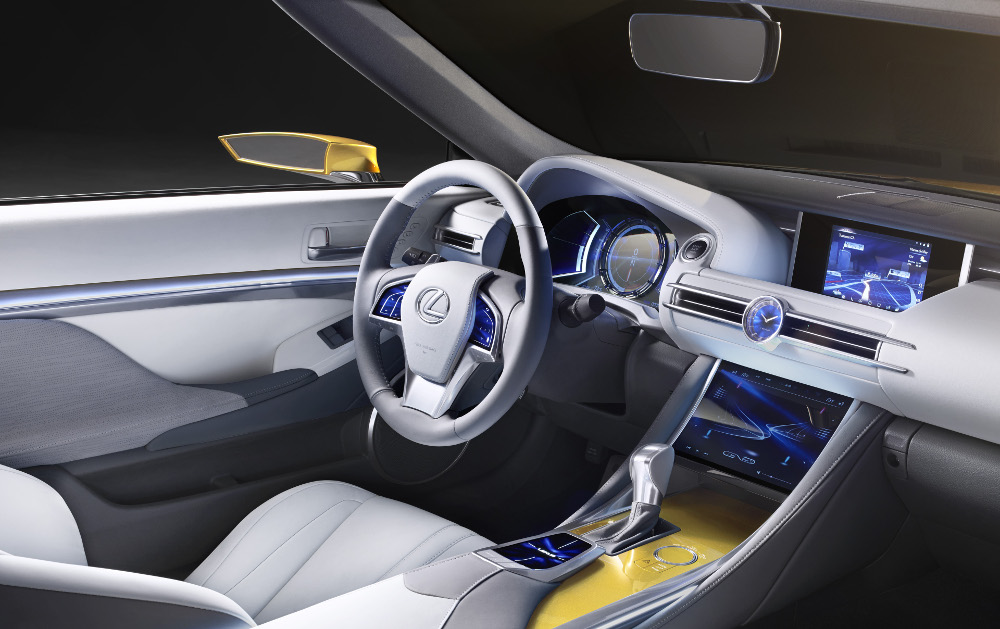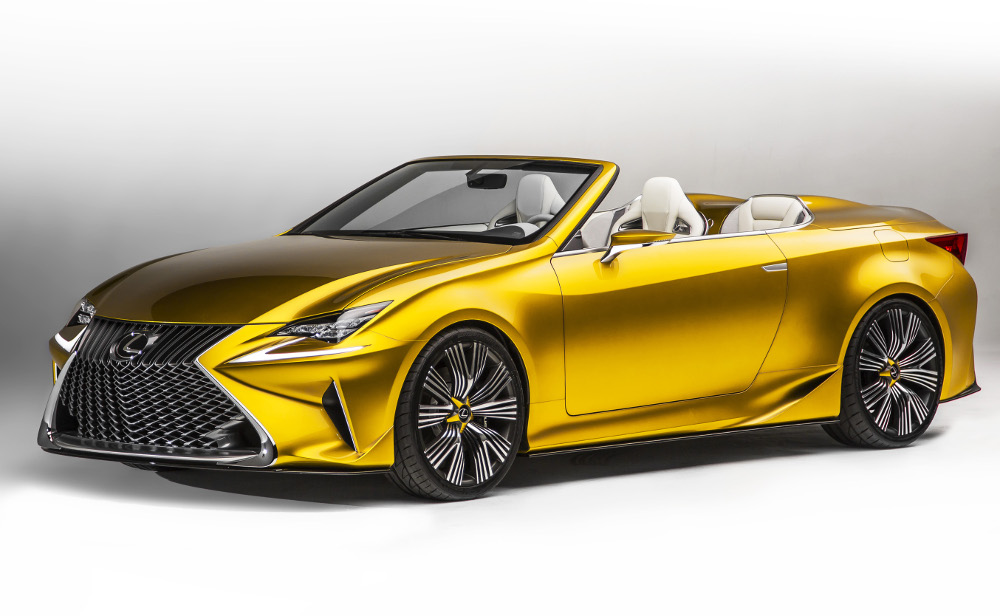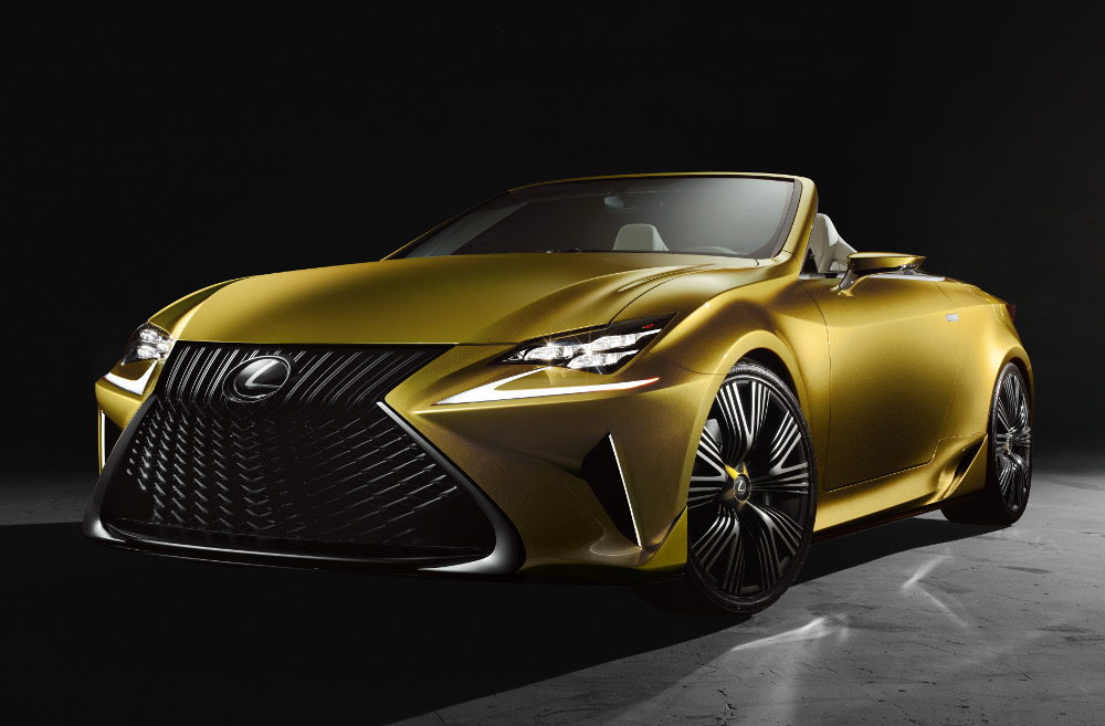 První vrstvou je základní barva, po němž následuje stříbrný čirý lak a poté žlutý odstín, jenž díky odrazům stříbrné vytváří jiskrně zářivý lesk. Maska je posazena mezi trojúhelníkové LED světlomety, typické pro sportovní modely značky Lexus, a stylová směrová světla, od nichž ubíhá charakteristická křivka LF-C2.