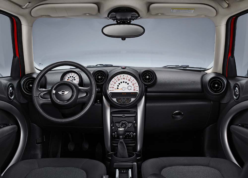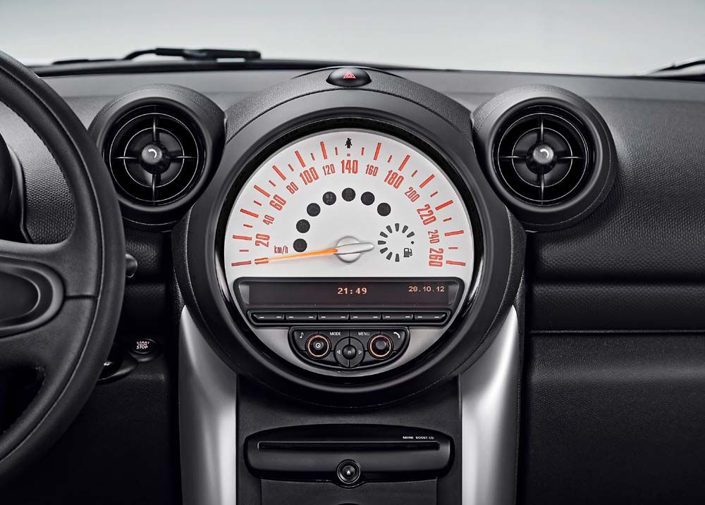 Od listopadu 2012 prošly všechny modely MINI Countryman zdokonalením. Po otevření předních dveří si všimnete nově navržené ozdobné lišty kolem centrálně umístěného velkého rychloměru a čtyř výdechů ventilace. Obroučky jsou v černém odstínu Carbon Black, uvnitř akcentován lesklým černým kruhem.