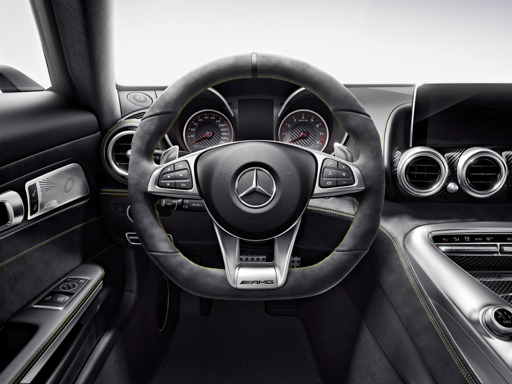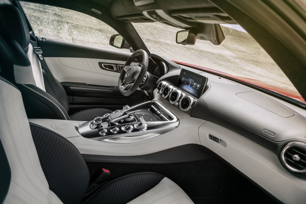 V levé části AMG DRIVE UNIT se nacházejí ovládací prvek DYNAMIC SELECT a tlačítka pro spuštění motoru, třístupňové ESP® a v závislosti na výbavě elektronicky řízené tlumiče. Na pravé straně je ovládací prvek pro nastavení hlasitosti společně s tlačítky pro režim manuálního řazení, funkci ECO Start-Stop a rovněž v závislosti na výbavě nastavitelnou výfukovou soustavu. Před pákou voliče E-SELECT dvouspojkové převodovky je integrován do opěrky ruky nad ovládacím prvkem systému COMAND inovativní touchpad. Centrálně nad čtyřmi výdechy ventilační soustavy se nachází volně stojící displej s úhlopříčkou 17,78 cm (7“), popř. ve spojení se systémem COMAND Online dokonce 21,33 cm (8,4“). Vyhřívání sedadel, PARKTRONIC, výstražná světla a v závislosti na výbavě výsuvný zadní spoiler ovládá řidič pomocí tlačítek v horním ovládacím panelu na stropní konzole.