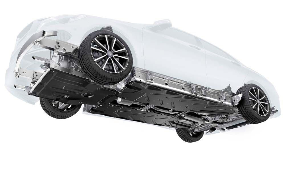 Velkoplošné zakrytí spodní části vozu, přídavné panely na prostřední části zadní nápravy a aerodynamicky optimalizovaný tlumič výfuku s navazujícím difuzorem zlepšují proudění pod vozem.