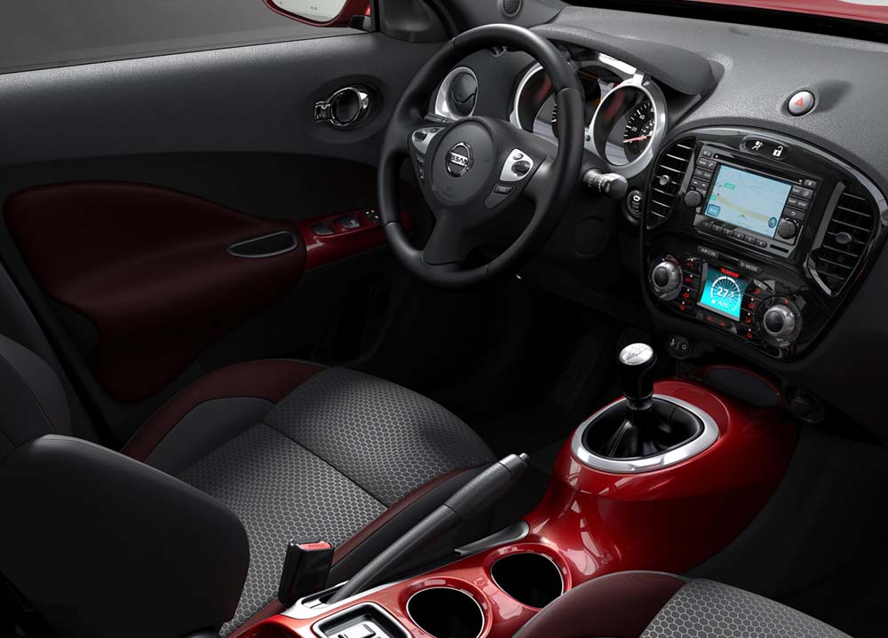 Také interiér nabízí atraktivní a neobvyklé prvky. Středová konzola našla inspiraci ve tvarech palivové nádrže motocyklu, u jednostopých vozidel se inspirovala i přístrojová deska. Juke však není jen originální a stylový, je zároveň i praktický a pohodlný. Například novým interaktivním rozhraním Nissan Dynamic Control System může řidič snadno a rychle nastavit klimatizaci či dynamická nastavení vozu bez toho, aby se potýkal s množstvím ovladačů.