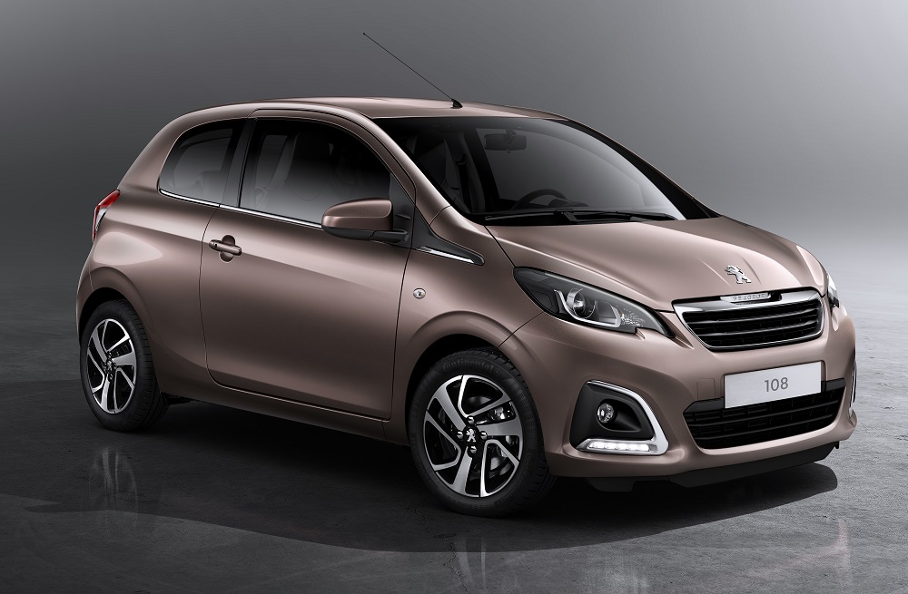 Peugeot 108 je určen pro městský provoz, přední světlomety jsou pevně zabudovány do karoserie. Technologické projektory dodávají kombinací černé barvy a chromu vozu pronikavý pohled. V horní části je do nich vsazena LED dioda. Při pohledu z boku zvýrazňují kompaktnost převisy, zkrácené na maximum. Dveře zasahují téměř od jednoho kola k druhému.
