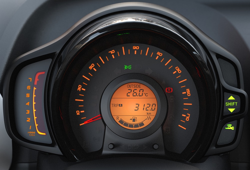 I přes kompaktní vnější rozměry vozu se v interiéru skrývá pohodlná kabina. Řidič přímo před sebou nalezne komplexní do jednoho místa sdružené informace. Přístrojová deska je spojená s výškově nastavitelným sloupkem řízení. Přístrojovou desku tvoří soustředně umístěný analogový tachometr a LCD displej. Z obou stran je na rozšířeních umístěný otáčkoměr a ukazatel řazení rychlostních stupňů.